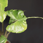 Alocasia ‘Stingray Aurea’ is a highly variegated form of Alocasia macrorrhizos ‘Stingray,’ selected for its upright, sculptural growth and bold, lime-to-yellow pigment mutation. Each leaf curves into a winged silhouette with a signature tail-like tip, overlaid with unpredictable swirls, sectors, and split tones in chartreuse, pale yellow, and soft mint.