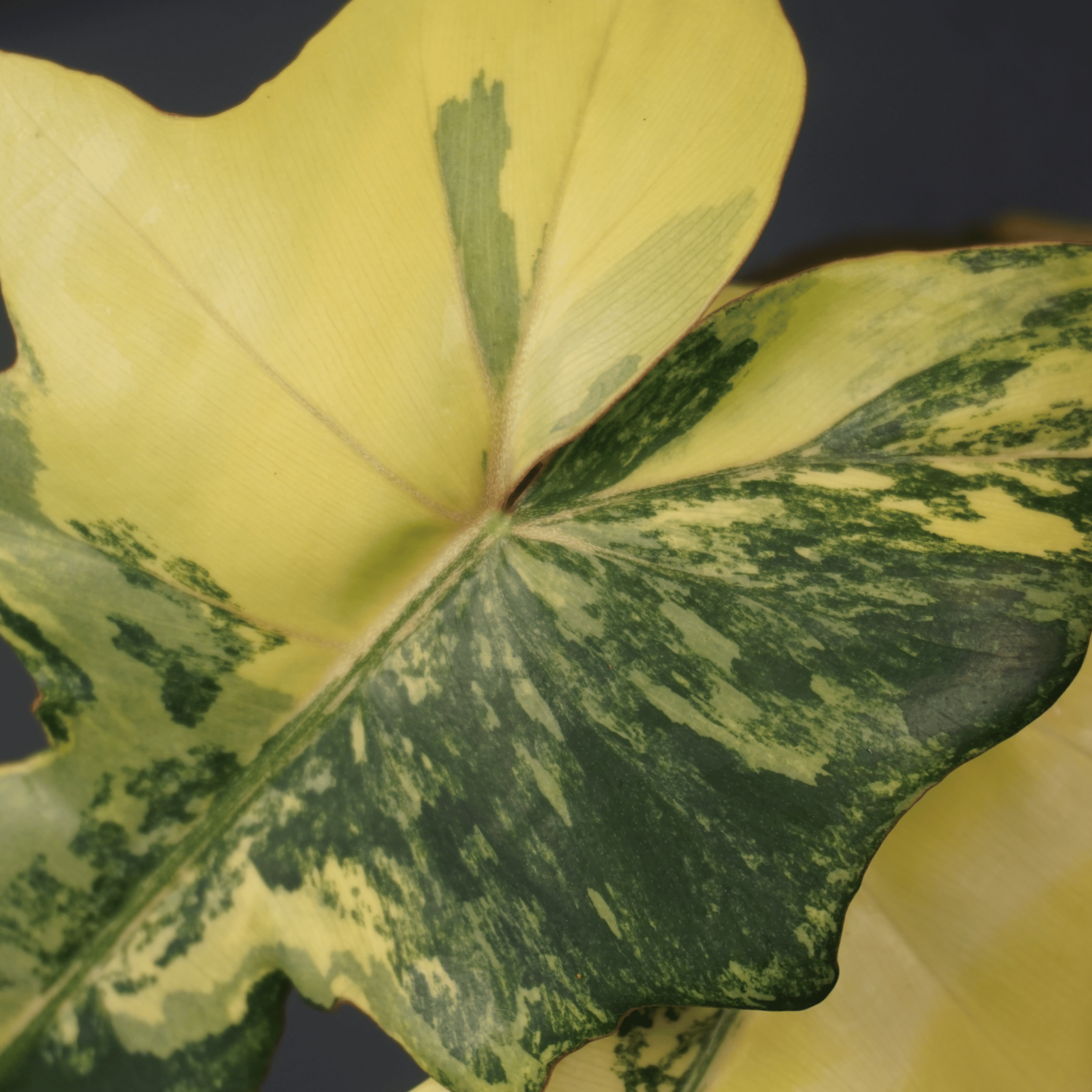 Philodendron Florida Beauty × Mayoi is a climber, producing large, multi-lobed leaves with bold sectoral and marbled variegation in cream, lime, and pale yellow. Unlike pure Florida Beauty, which tends to stay more refined, this cross throws leaf shapes that lean wild and asymmetrical—especially as it matures. And it grows fast. Give it a pole and it’ll take the invitation seriously.