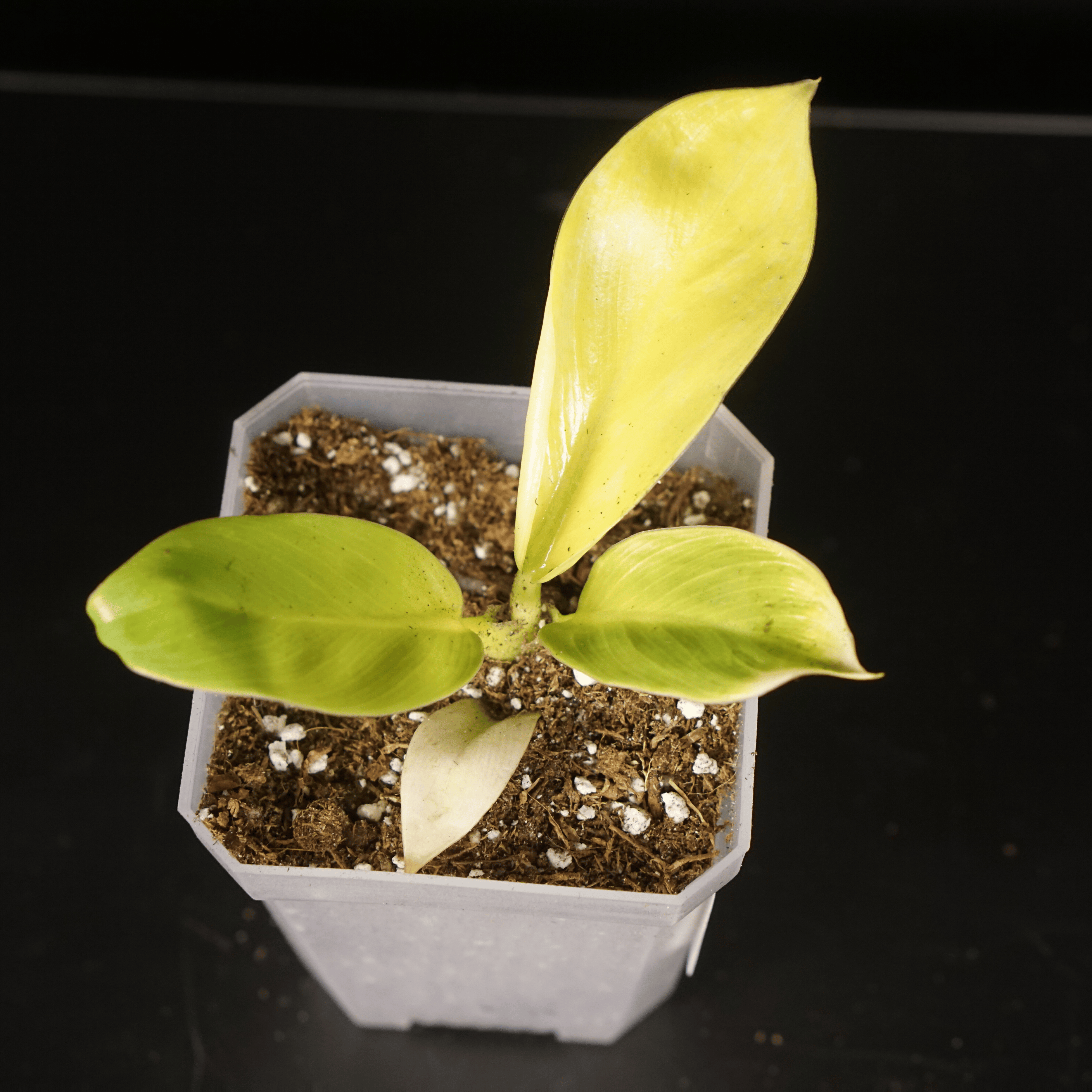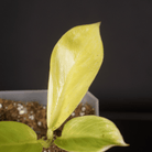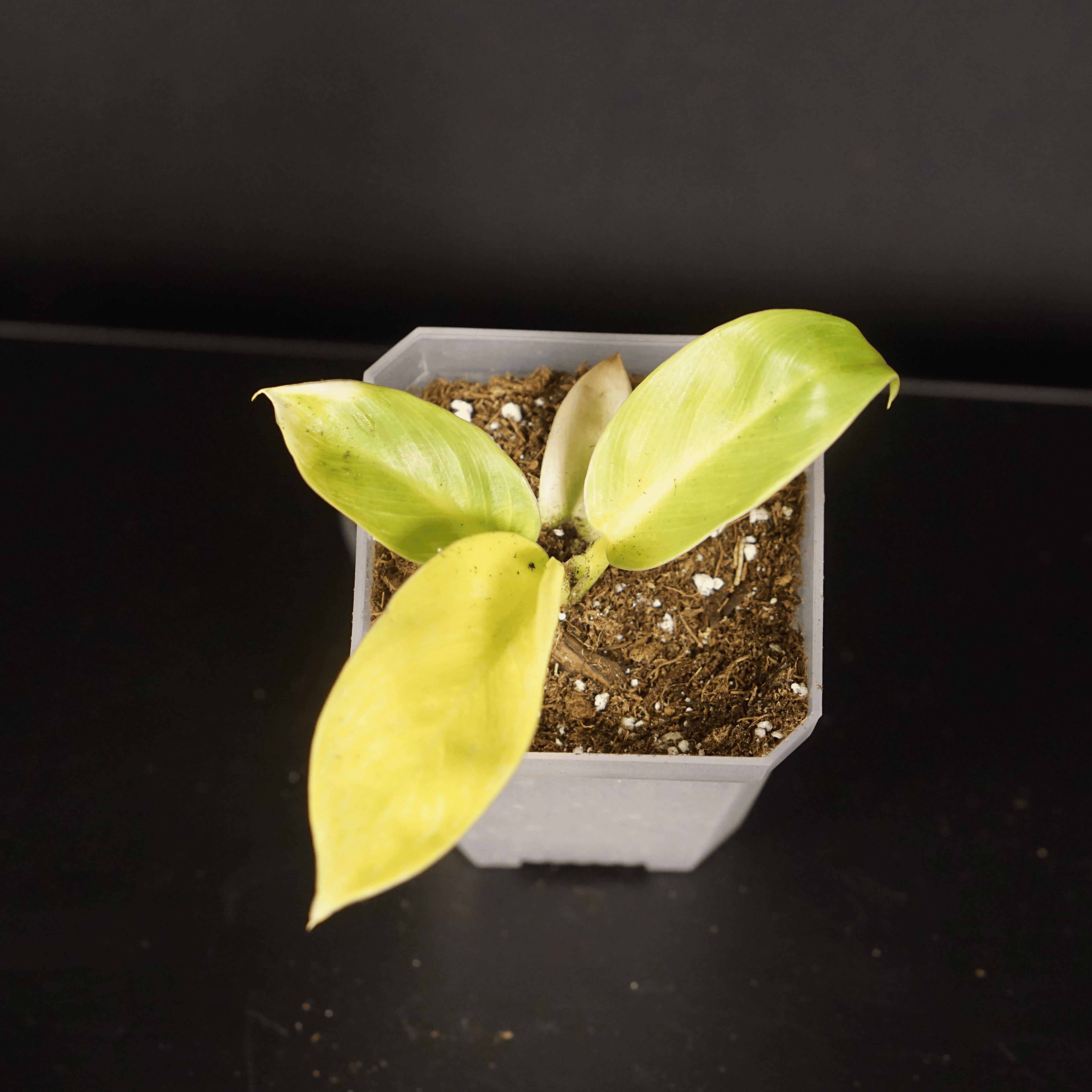 Philodendron ‘Moonlight’ is a self-heading hybrid known for its low, spreading structure and chartreuse foliage. In the variegated form, the typical neon green leaf is interrupted by chimeric color mutations—producing irregular patterns in white, mint, and pastel yellow, often expressed as marbling, swirls, or full-leaf sectors.