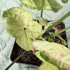 Syngonium ‘Milk Confetti Tricolor’ is a highly variegated form of Syngonium podophyllum prized for its three-way pigment expression: vivid pink flecking, creamy white base coloration, and soft mint-to-light-green margins. No two leaves are alike. Some emerge heavily pink, others lean nearly white, and some look washed in pale green like watercolor on paper.