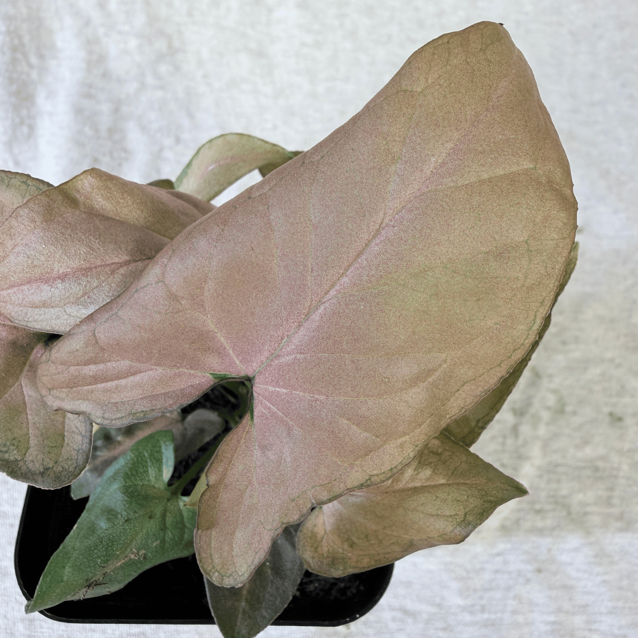 Syngonium ‘Pink Perfection’ lives up to its name with broad, heart-shaped foliage washed in soft pink to warm blush tones, occasionally layered with subtle undertones of ivory or lime. This is not a speckled or splash-type Syngonium — it’s a stable, pigment-forward cultivar where nearly every leaf emerges in shades of pink due to strong anthocyanin expression and reduced chlorophyll in developing tissue.