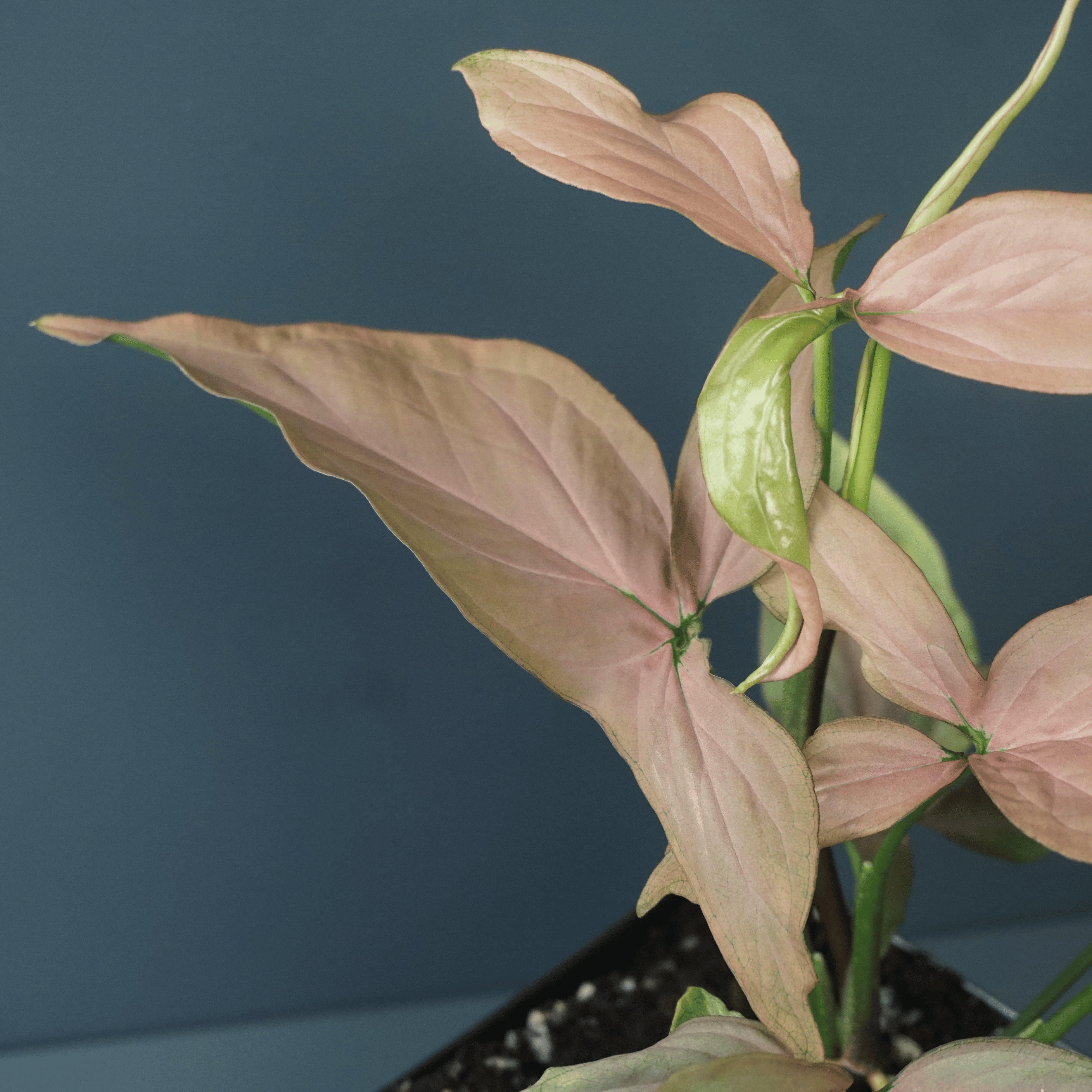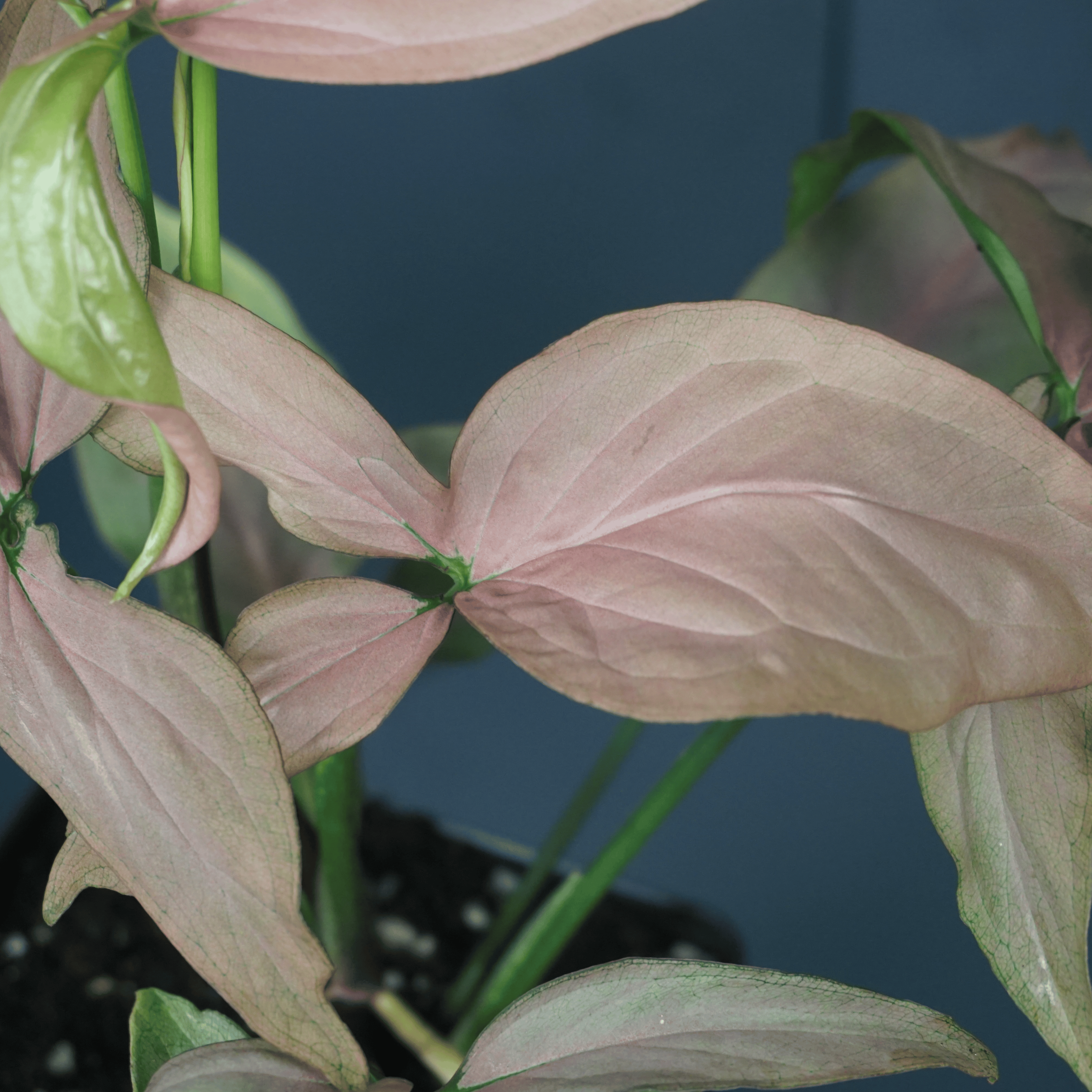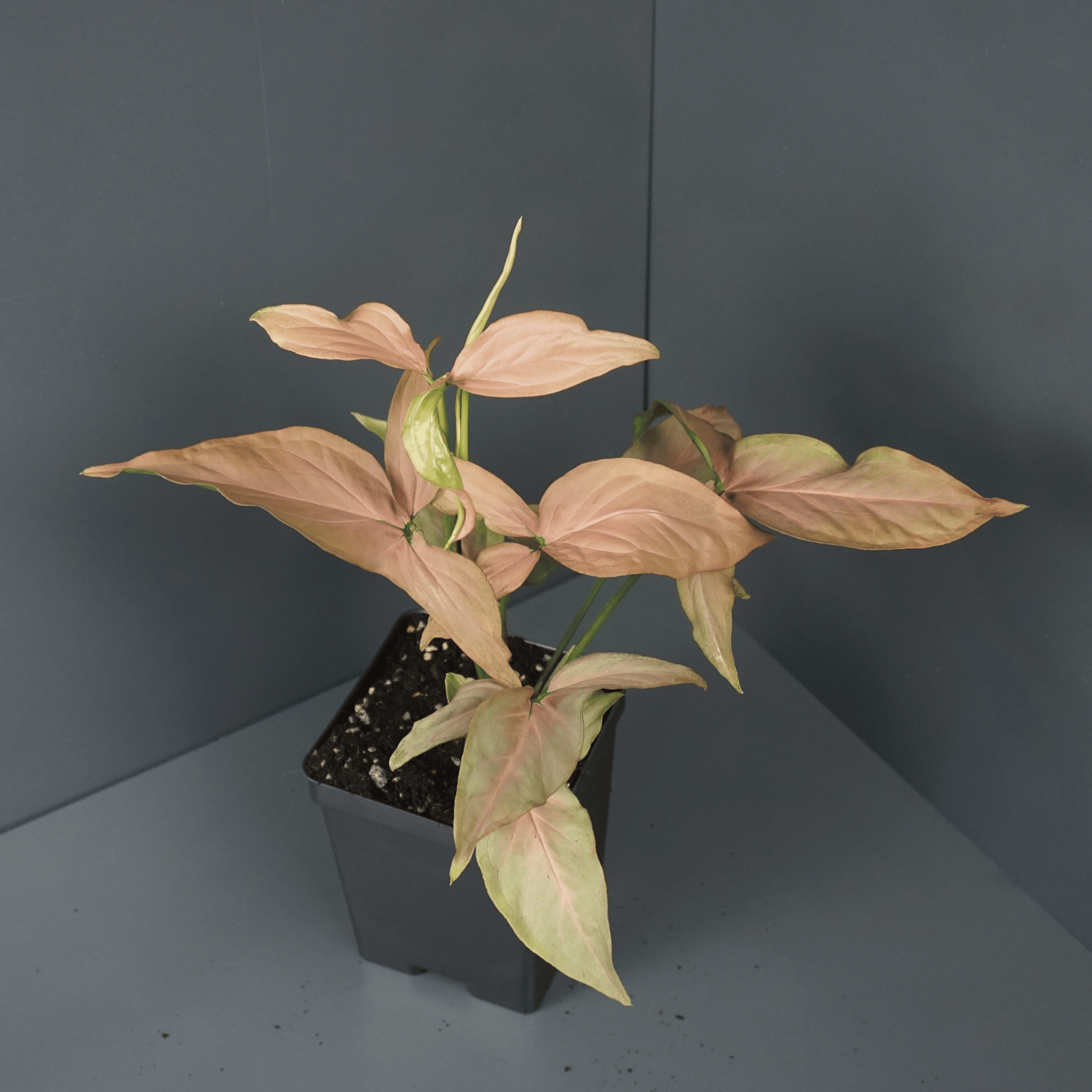 Syngonium ‘Pink Perfection’ is a pigment-forward cultivar of Syngonium podophyllum known for its soft pink to blush-toned foliage and consistent coloration. It offers a refined, uniform look rather than speckled or high-contrast variegation.